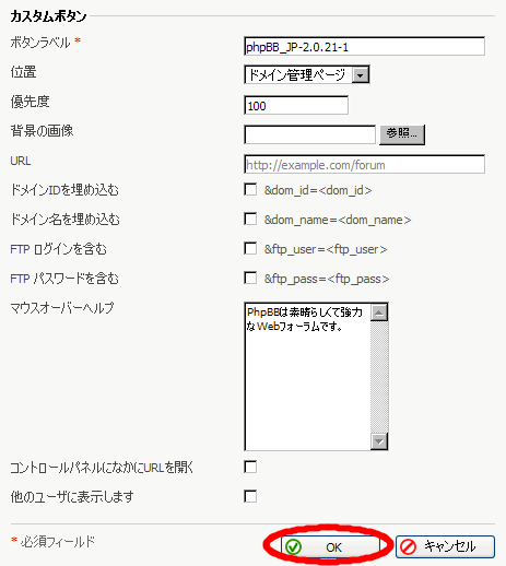 (1)はPleskコントロールパネルにphpBBへアクセスするためのボタンを作るかどうかを設定します