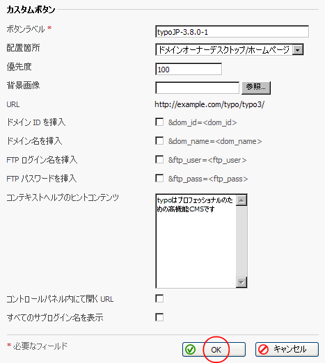 (1)はPleskコントロールパネルにtypoへアクセスするためのボタンを作るかどうかを設定します