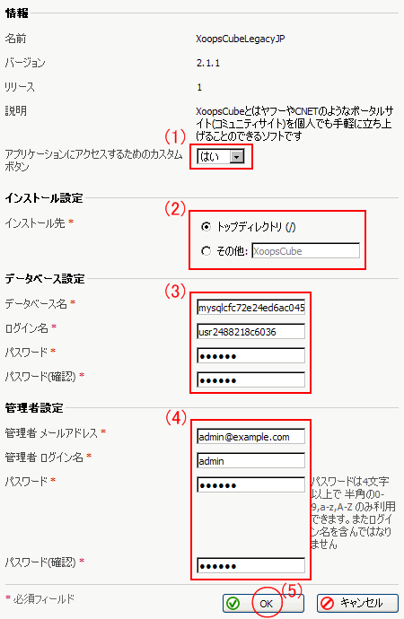 (4)ではXOOPS Cube(Legacy)の管理者情報を設定します。