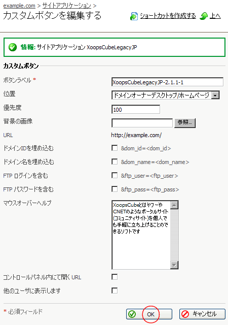 (1)はPleskコントロールパネルにXOOPS Cube(Legacy)へアクセスするためのボタンを作るかどうかを設定します