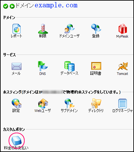 Pleskコントロールパネルにログインし、 カスタムボタンにある料金のお支払いを選択(クリック)します。