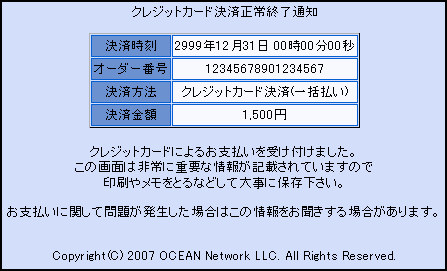 決済が正常に完了するとクレジットカード決済正常終了通知画面となります。