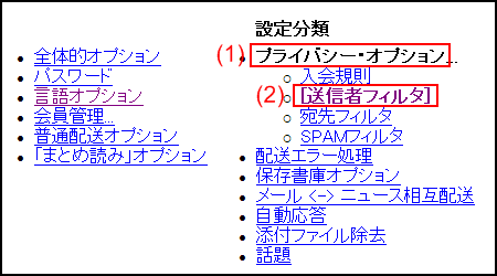 するとサブメニューが現れますので「送信者フィルタ」(2)をクリックします。